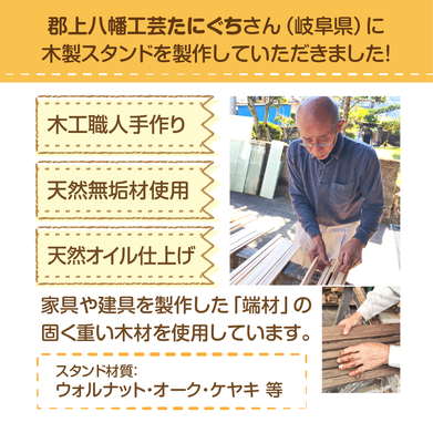 木製スタンドは、ベテラン木工職人の郡上八幡工芸たにぐちさんに製作していただきました!