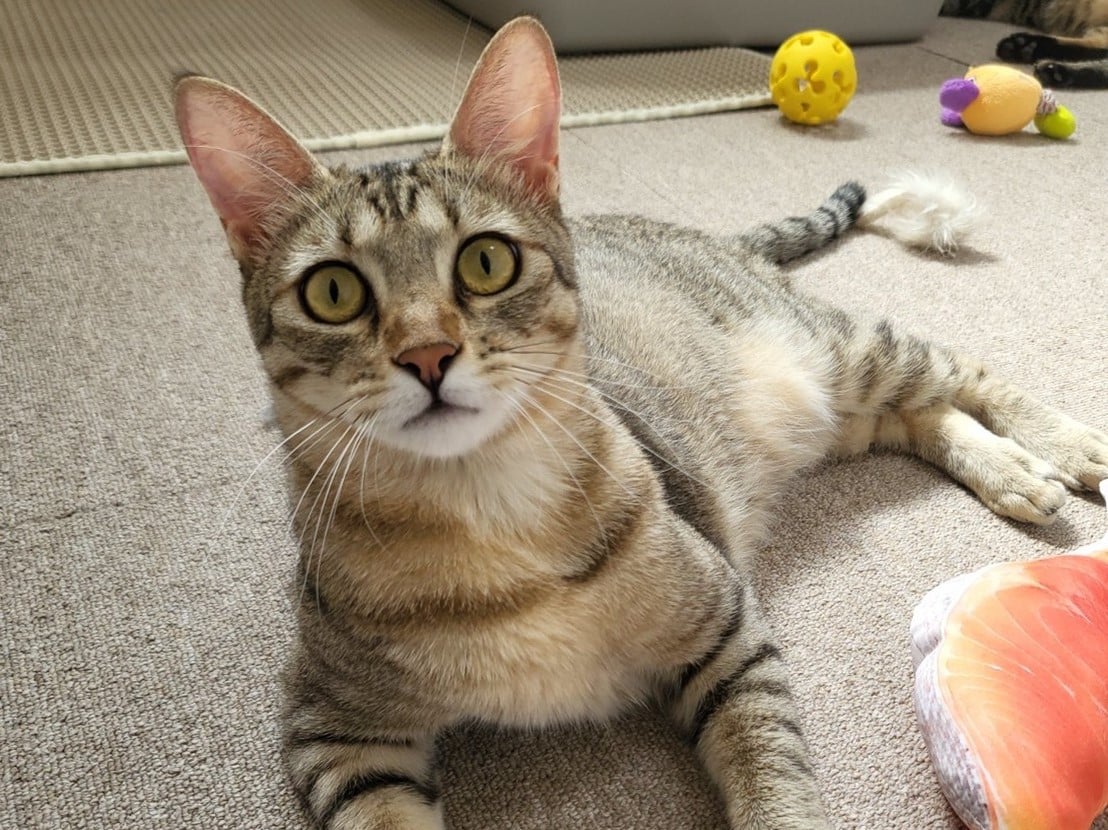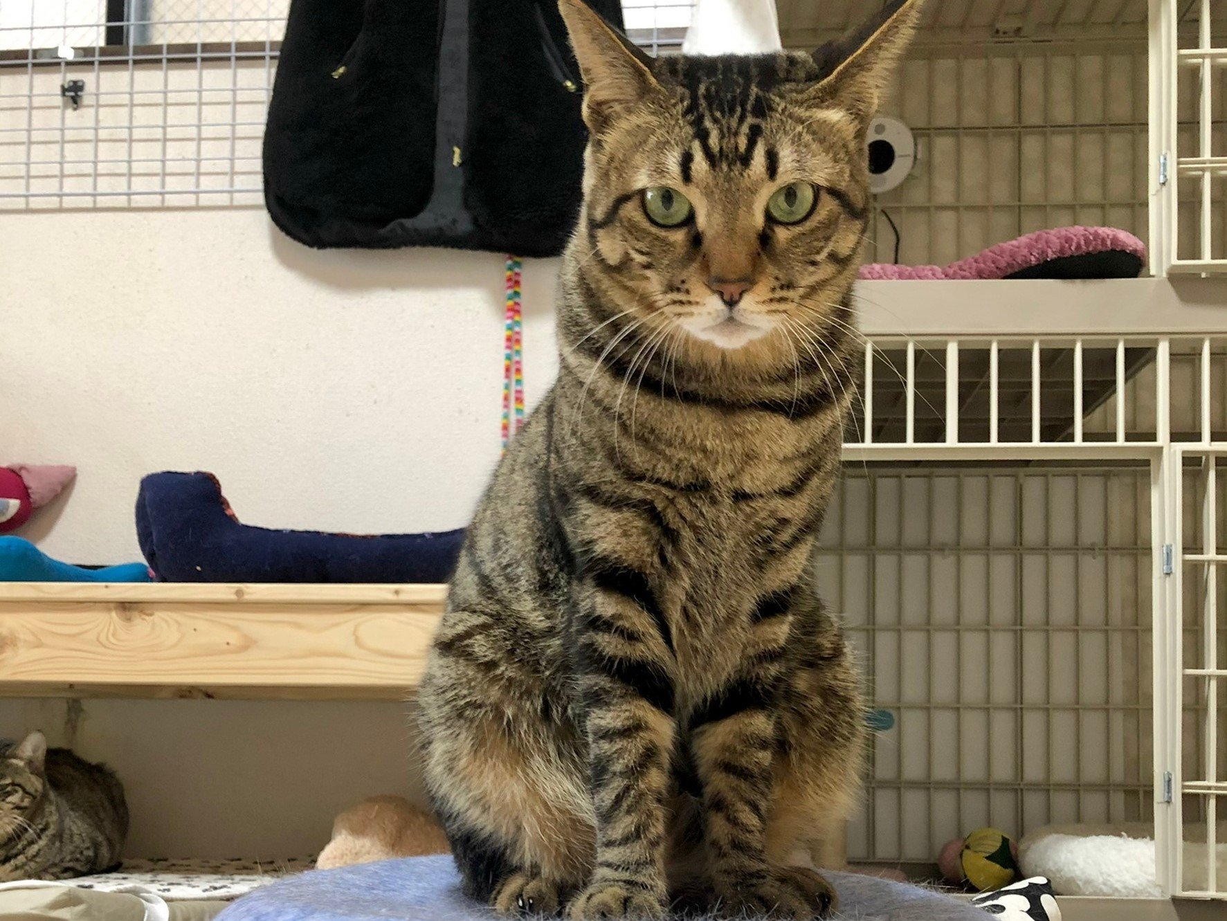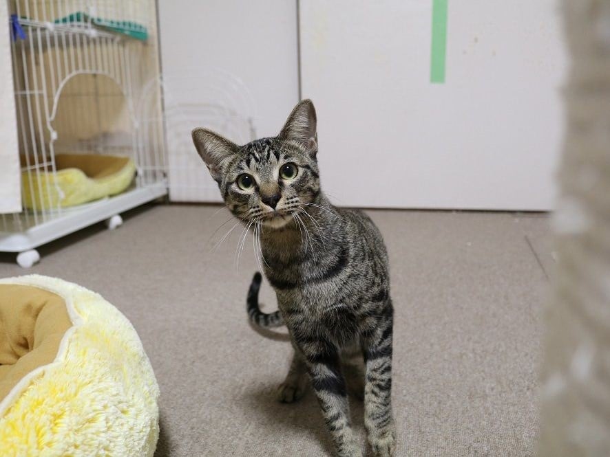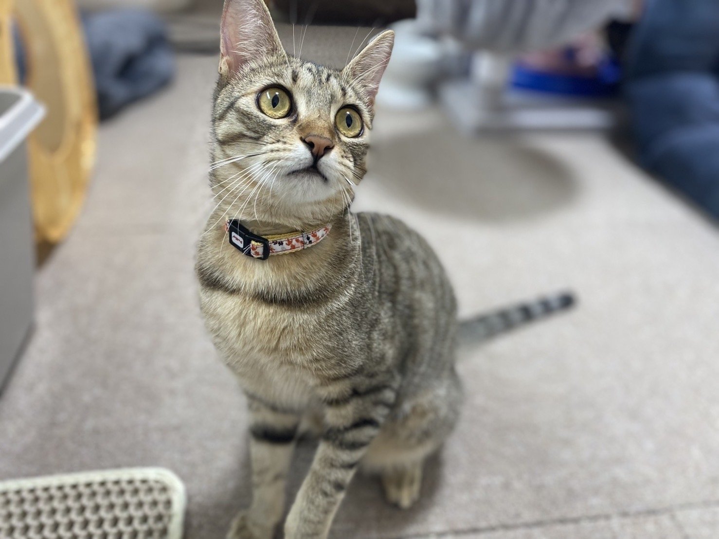 キジ柄の色が少し薄くて、手足がすらっと長く、垂れ目が印象的な美人猫さんです^_^