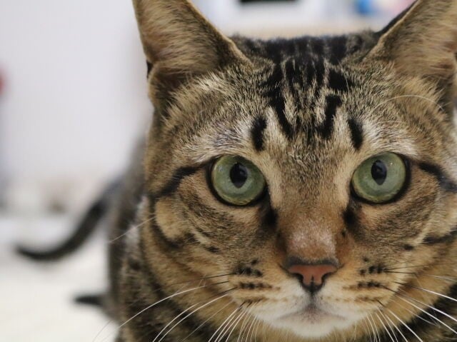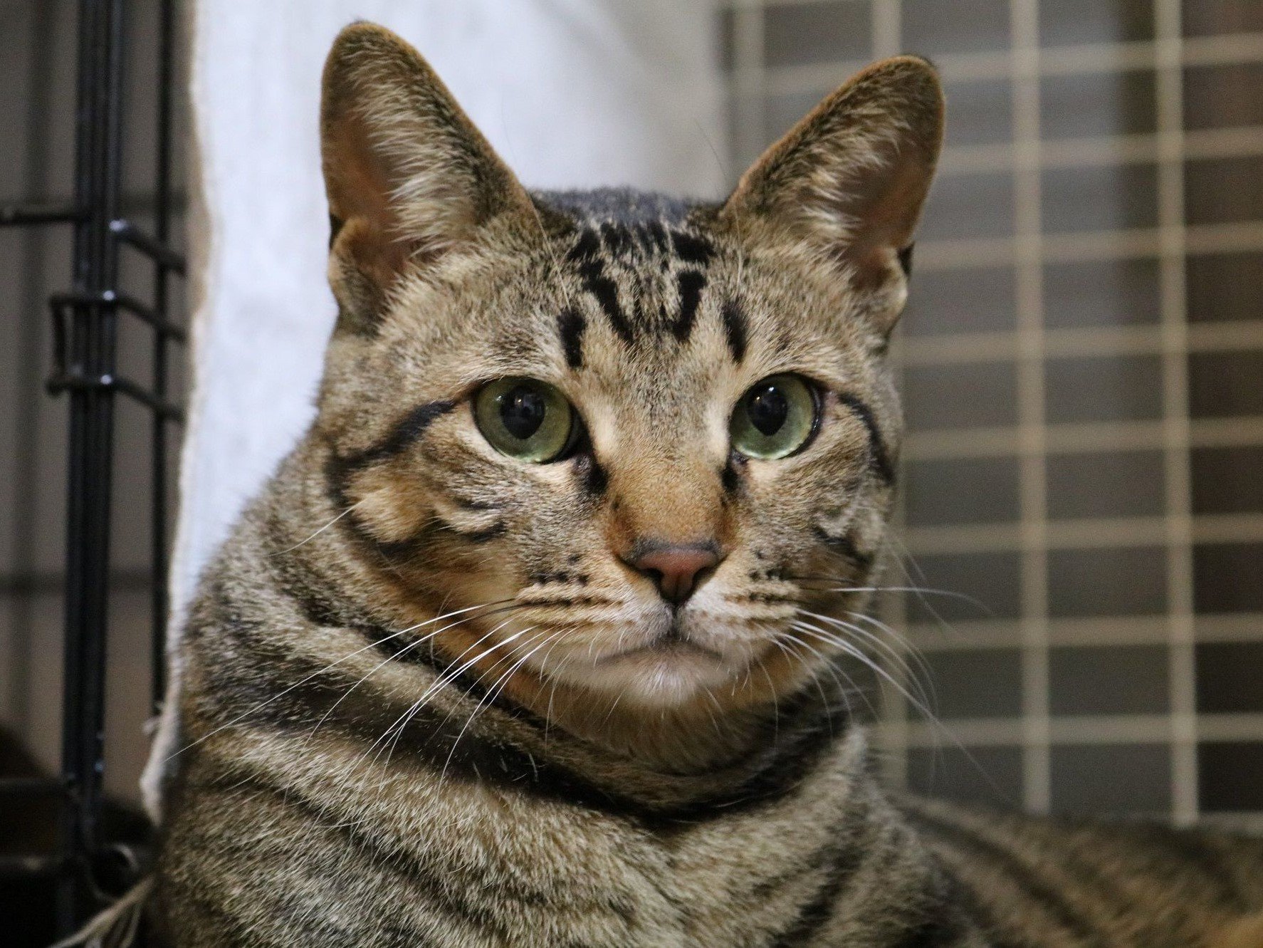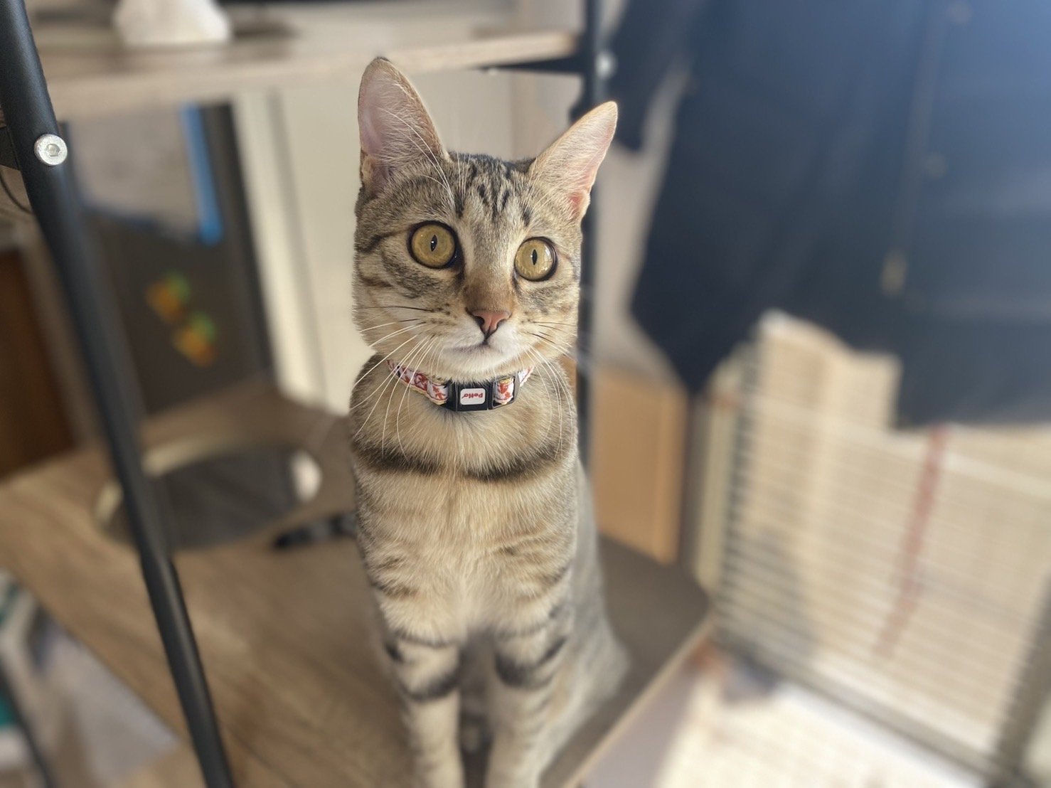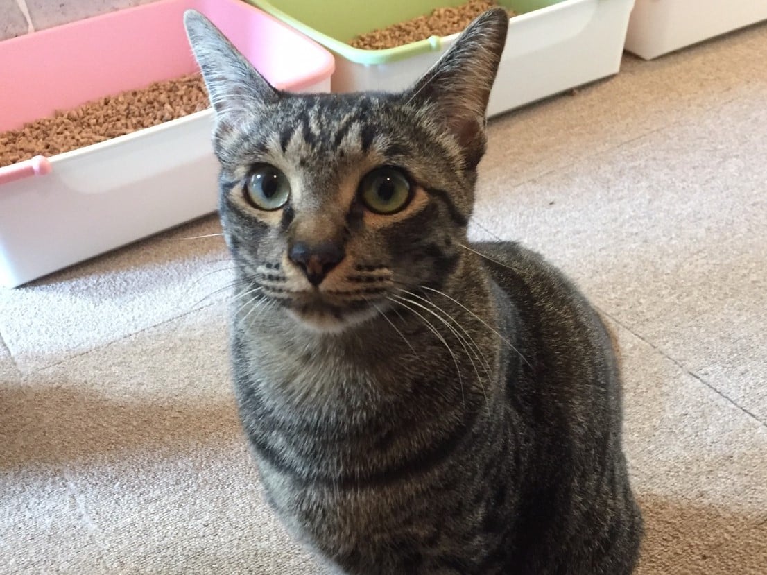 キジ柄の色が少し薄くて、手足がすらっと長く、垂れ目が印象的な美人猫さんです^_^
