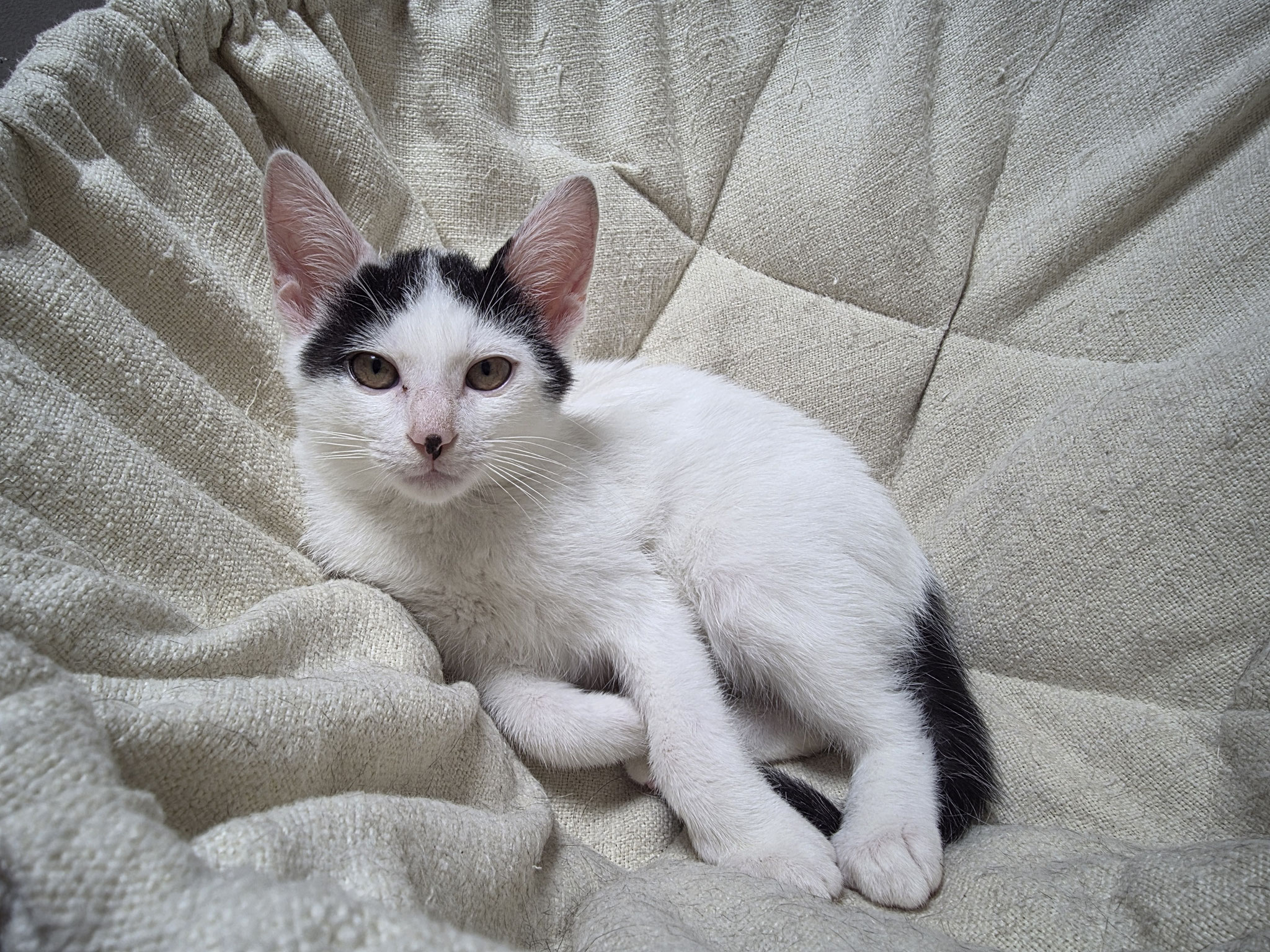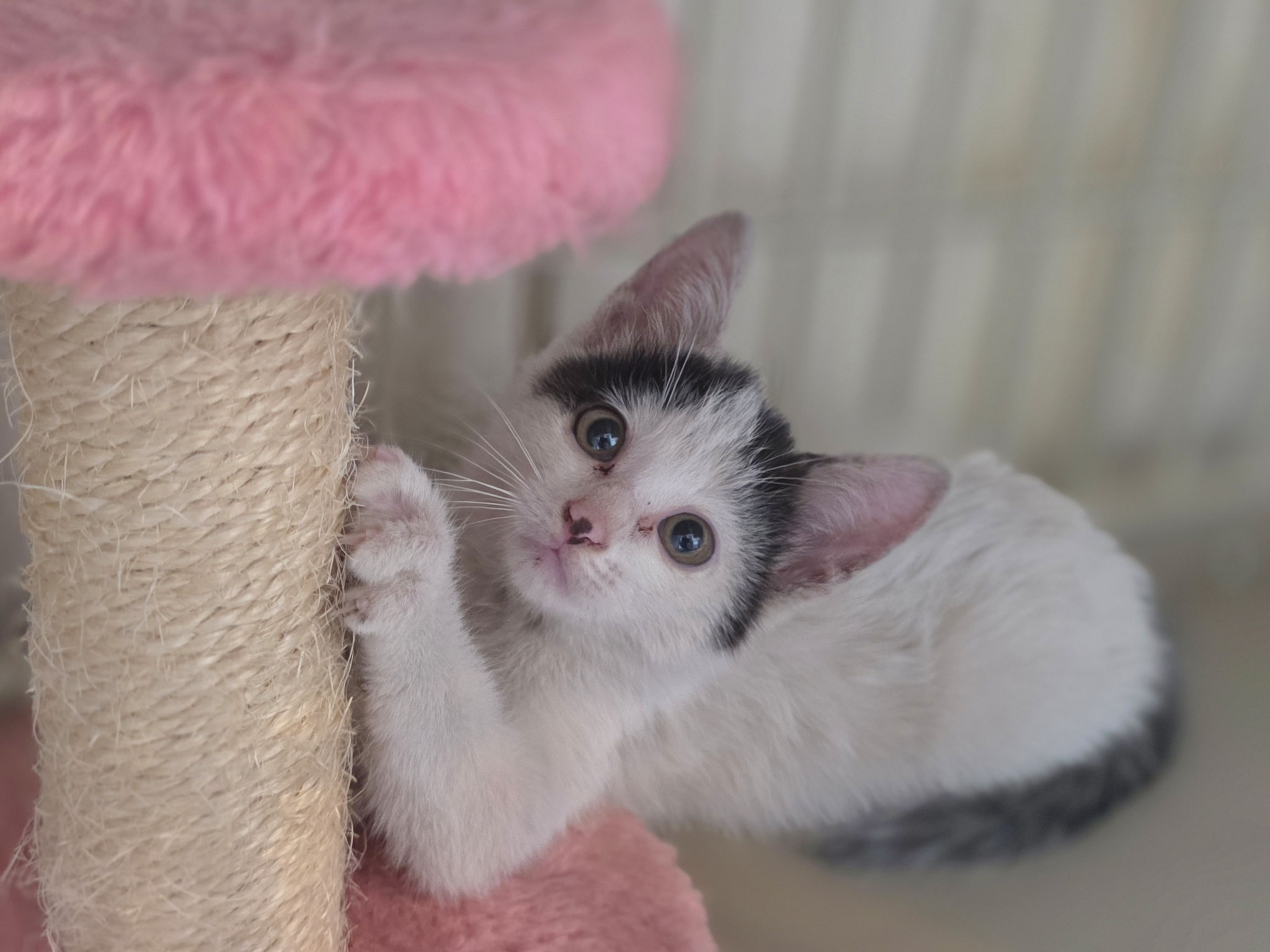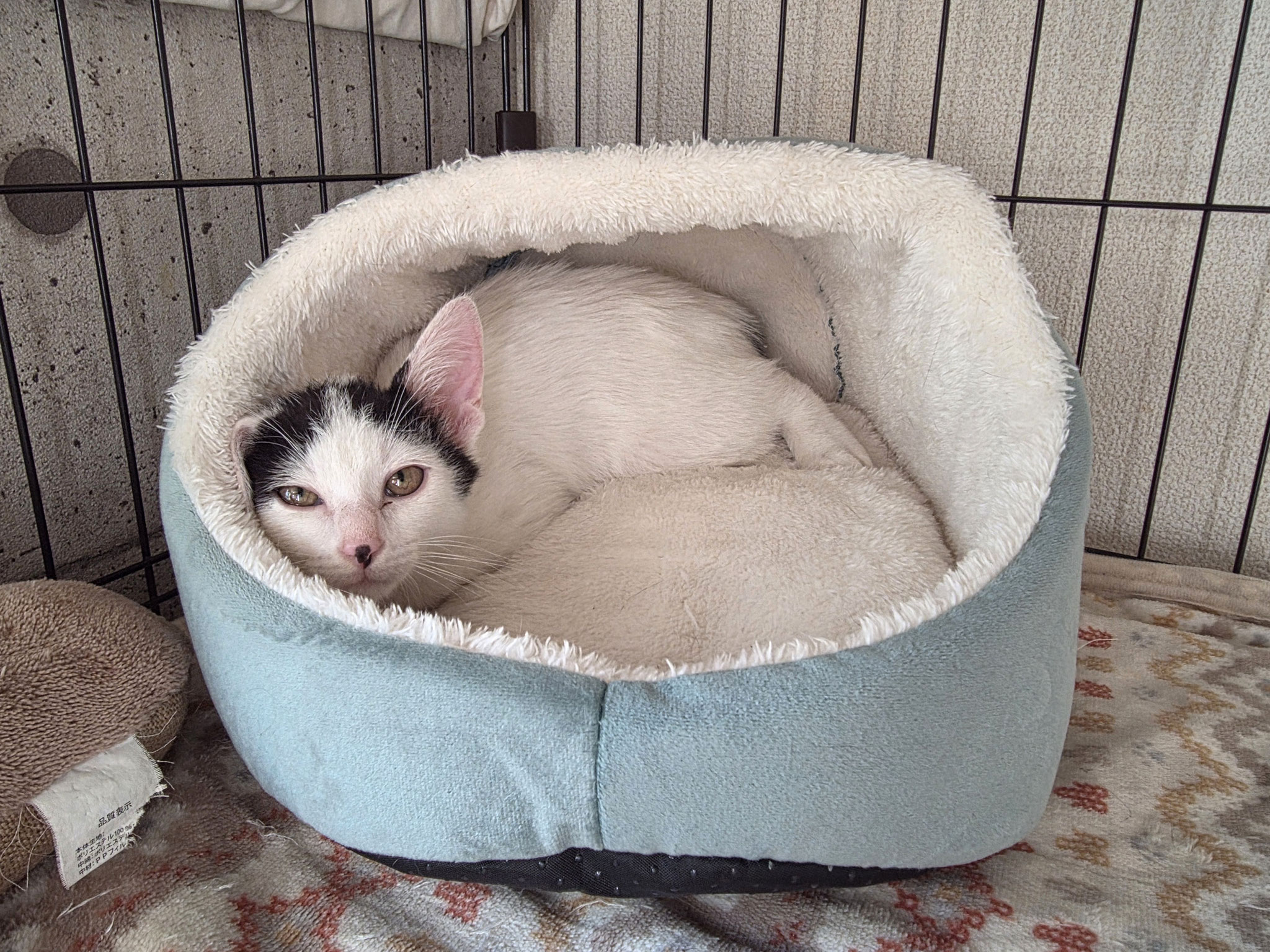 そんなうずら坊でしたが、保護部屋では先輩にゃんずと追いかけっこや取っ組み合いをして遊んだり、目に入るものに次から次へと反応したり…と、落ち着きのない小学生みたいな感じで、保護部屋の中を楽しそうに走り回って過ごしてます。